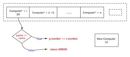 | Status Enter(SqList &L, const Computer &c) { for (int i = 0; i < L.length; i++) { if (strcmp(c.type, L.elem[i].type) == 0) { if (c.price == L.elem[i].price) { L.elem[i].number += c.number; return OK; } else { cout << "提示:" << endl; showInfo(L.elem[i]); return ERROR; }