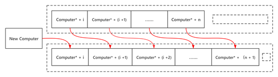 第二种情况入库一种新型号的电脑,那么则要插入一个新的数据元素(Computer)到仓库中,并且在插入之前还要检查有序表的内存空间(listsize)是否充足,如果不足,则需要再分配有序表的内存大小,即为顺序表增加一个大小为存储LISTINCREMENT个数据元素的空间。然后,根据有序表的排序方式(L.sortWay),找到可以插入元素的地址。插入时,先将该地址及以后的地址全部后移一位,接着将当前地址写入要入库的数据元素。
