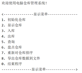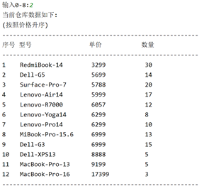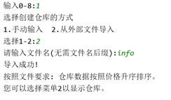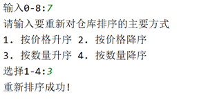 - 您可以选择菜单项“7.重新对仓库排序”,按照您喜爱的方式对仓库排序,本程序提供了四种主要排序方式:1-按照价格升序、2-按照价格降序、3-按照数量升序、4-按照数量降序