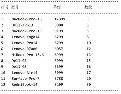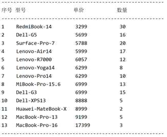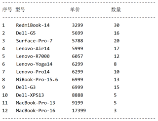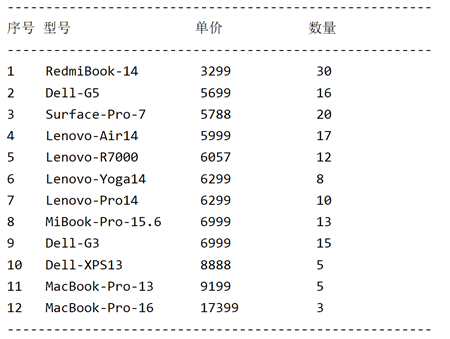 | Computer Warehouse Data The information is as follows: Sort Way: 1 (Ascending by price) Total Type: 12 RedmiBook-14 3299 30 Dell-G5 5699 14 Surface-Pro-7 5788 20 Lenovo-Air14 5999 17 Lenovo-R7000 6057 12 Lenovo-Yoga14 6299 8 Lenovo-Pro14 6299 10 MiBook-Pro-15.6 6999 13 Dell-G3 6999 15 Dell-XPS13 8888 5 MacBook-Pro-13 9199 5 MacBook-Pro-16 17399 3