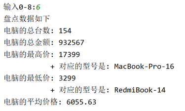 - 盘点:电脑的总台数,总金额,最高价,最低价,平均价格。