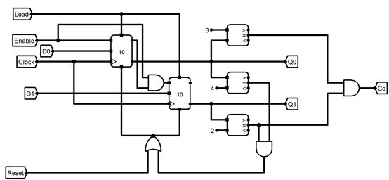 计数器A的进位输出端是计数器B的使能端(Enable)触发条件,每十次触发一次计数器B,同时,检测计数器A和B的状态输出端,当状态值为23时,使整个电路的进位输出端为1,当状态值为24时,异步清零,使计数器A和B的Q均为0。这样就完成了24进制计数器的功能。