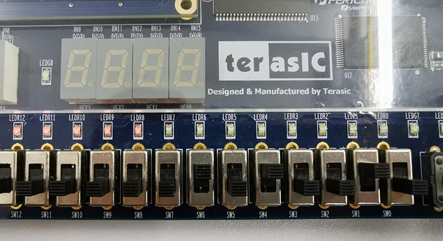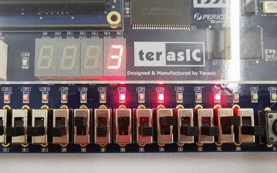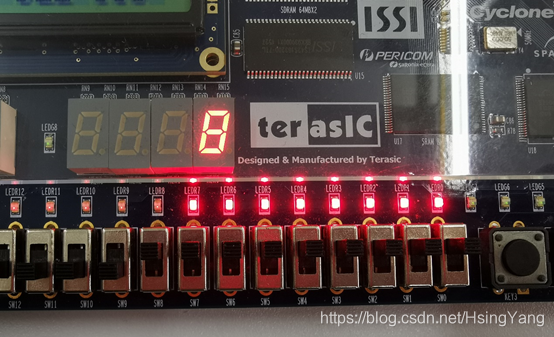 如下面两图所示,7端数码管HEX0可以根据正确显示:SW0-SW7的对应故障个数: